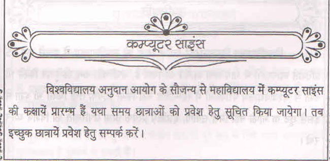 महाविद्यालय में कम्प्यूटर शिक्षण की व्यवस्था हैं, जिससे योग्य एवं अनुभव कम्प्यूटर साइन्स में प्रशिक्षण दिया जाता हैं | इच्छुक छात्राओं को कम्प्यूटर विज्ञान विभाग से सम्पर्क करके प्रवेश प्राप्त करना होगा | महाविद्यालय में इन्टरनेट सुविधा भी उपलब्ध हैं |